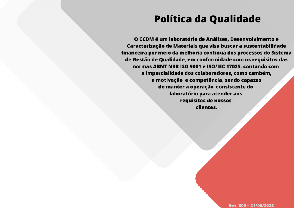 O CCDM é um laboratório de Análises, Desenvolvimento e Caracterização de Materiais que visa buscar a sustentabilidade financeira por meio da melhoria contínua dos processos do Sistema de Gestão de Qualidade, em conformidade com os requisitos das normas ABNT NBR ISO 9001 e ISO/IEC 17025, contando com a imparcialidade dos colaboradores, como também, a motivação e competência, sendo capazes de manter a operação consistente do laboratório para atender aos requisitos de nossos clientes.